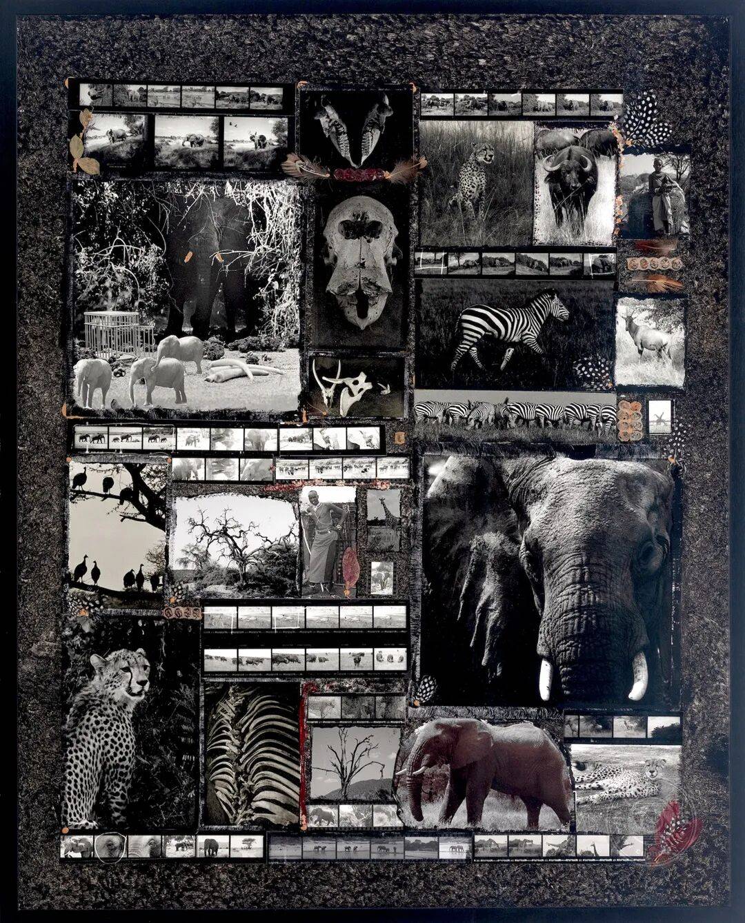 《它们不是战利品》是由我正在暗房中创制的肯尼亚濒危野矫捷物银盐相纸拼贴作品,采用接触印相法,联合金继工艺的金粉、肯尼亚药用种子、叶片与草本植物,铺陈于彩绘画布板之上。左上角实为银盐相纸行动后台置于黑盒中,火线列举着笼子、玩具枪、陶瓷象牙(由我亲手创制),经从新拍摄冲印后,其上迭加了“阴魂般”的白象拼贴。